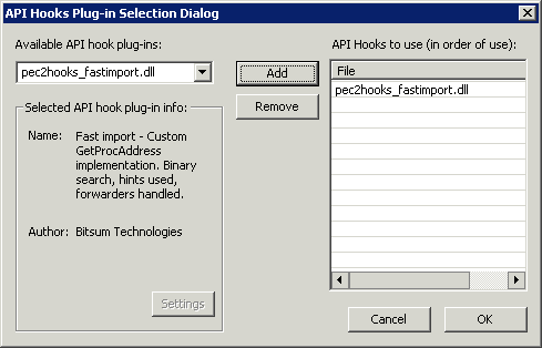 The API Hook Plug-in Selection Dialog allows for configuration of which API Hook Plug-ins should be attached to compressed modules. Any number of API Hook plug-ins may be used on a single compressed module.