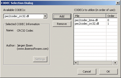 The CODEC Selection Dialog allows for specification of which CODECs should be used on the target file(s) and in what order they should be used.