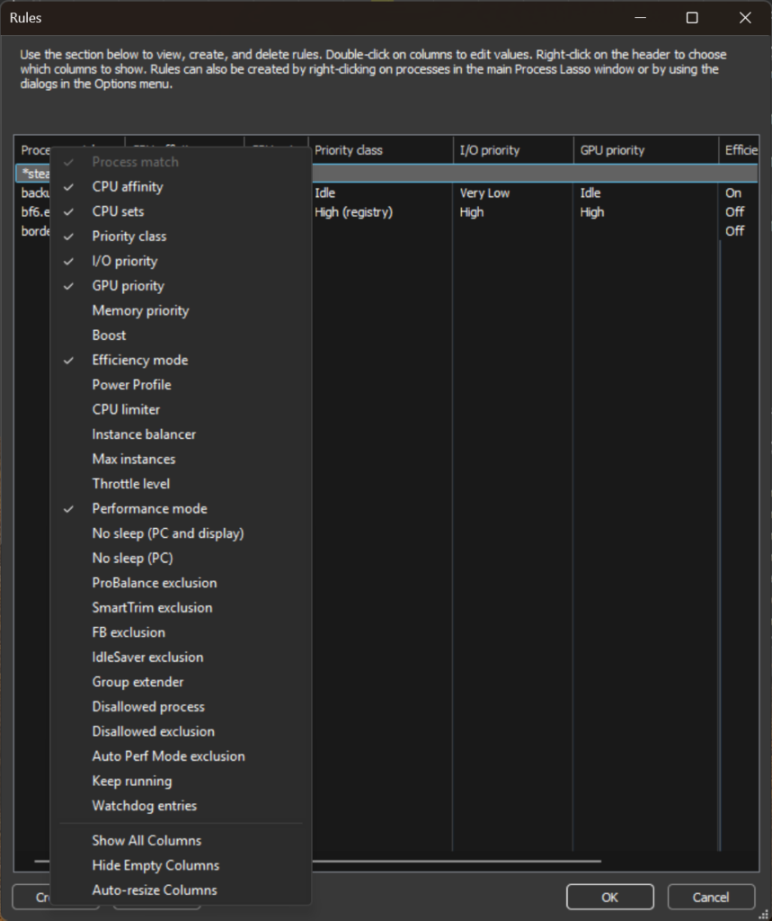 This is a big one! Process Lasso v17 adds a consolidated rules view and a process/game selection dialog. Now you can view and edit most of your process rules from a central location. This release also adds dark mode support to most supplemental dialogs, providing a more consistent user interface experience.